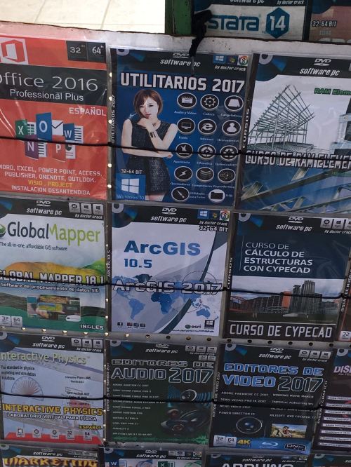 Como podreis ver se vende en un puesto callejero, distintas copias ilegales de software tecnologico y entre ellos el ArcGIS. Yo pensaba que se podian piratear en copia fisica, software de uso masivo como el ofimatico y de diseño grafico y bueno quizás el Autocad, pero ver el ArcGIS.. es porque debe ser un software de bastante uso por la zona.