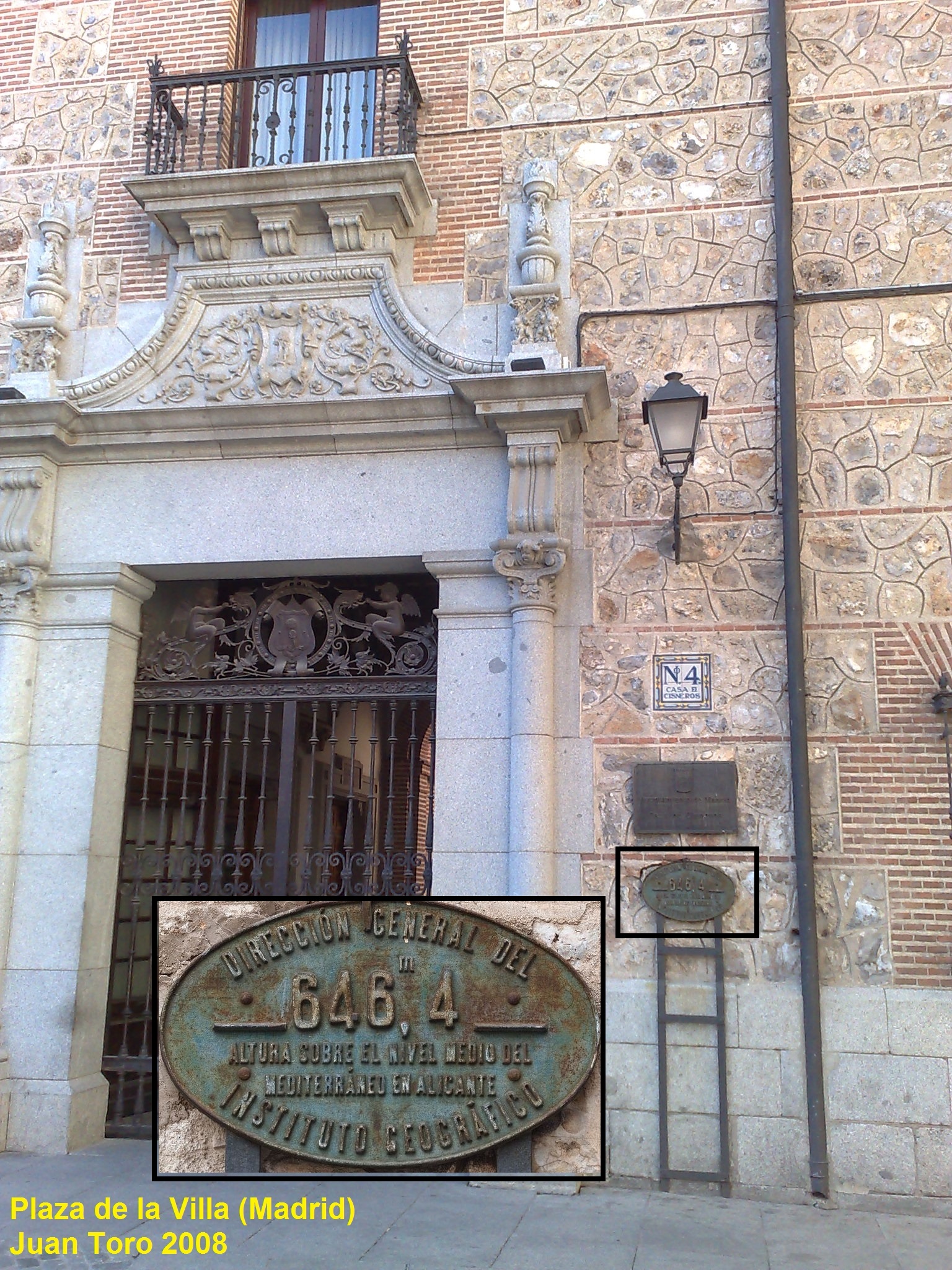 Subamos por la calle Mayor y en la Plaza de la Villa, hasta hace poco lugar donde estaba el Ayuntamiento de Madrid. En su lado izquierdo, en lo que fue la Casa de Cisneros, hay otra placa a una altura en el suelo de 646.4.