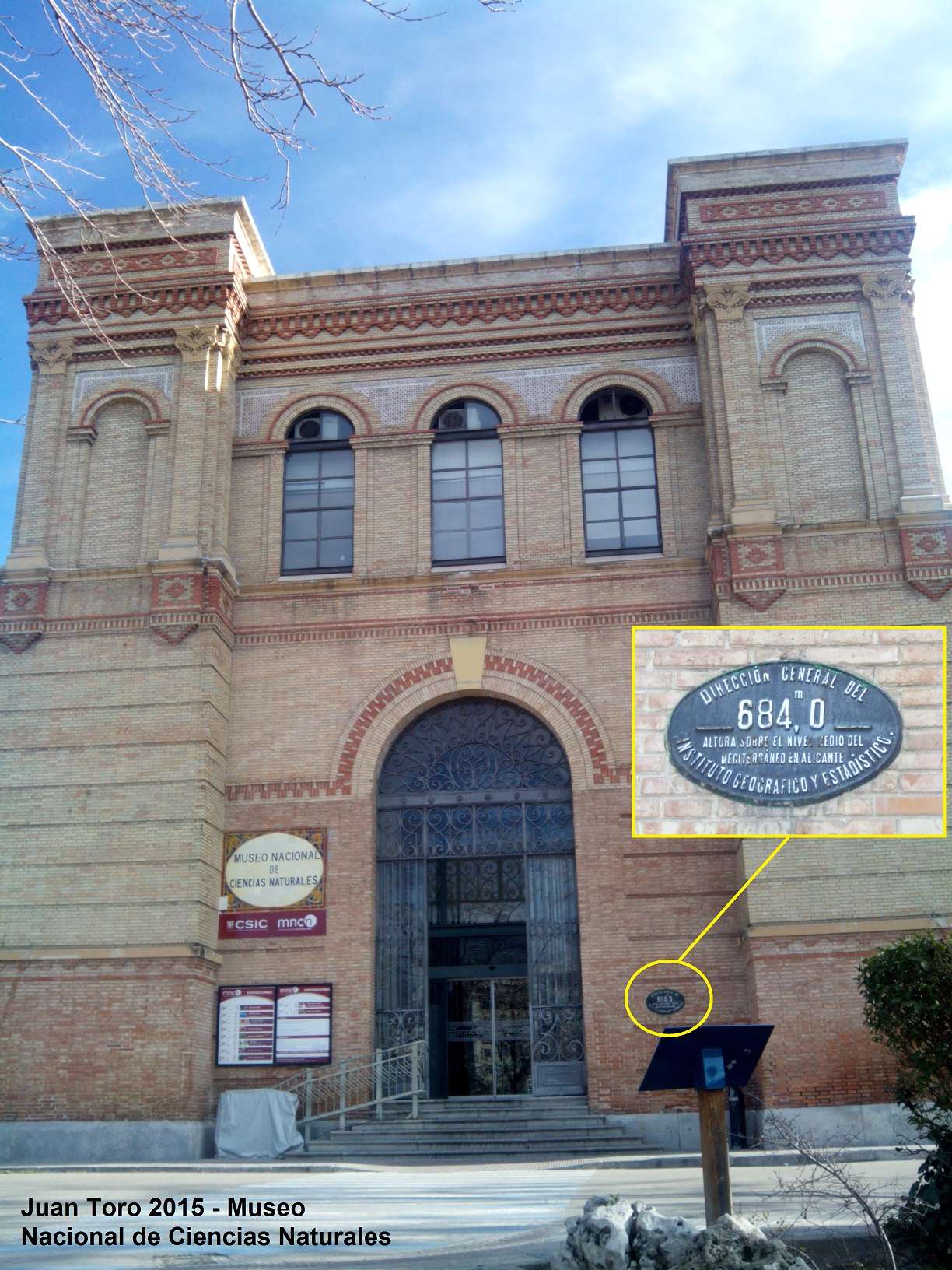 [Actualizado 11/01/2015] Subimos la Avenida de la Castellana, hasta un poco más arriba de María de Molina, llegamos a la calle José Gutierrez de Abascal, allí está la Escuela de Ingenieros Industriales y el Museo Nacional de Ciencias Naturales. En la fachada de este último, con una altura impresa de 684 metros, tenemos otra placa.