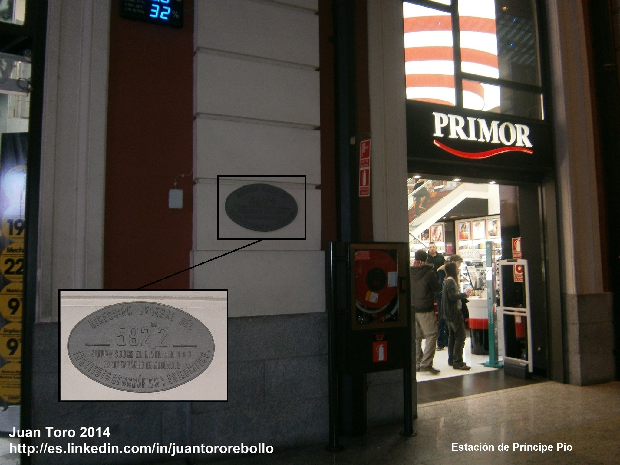 Cambiemos de estación de tren y nos situamos en la de Príncipe Pío, hoy convertida en estación Intercambiador de transportes de Metro, Cercanias Renfe y autobuses hacía la Móstoles, Alcorcón, Navalcarnero…, lo que fue la nave principal de la Estación del Norte, hoy es centro comercial, entre «las tiendas de dos franquicias» hay otra señal a la que se llegó con un itinerario a una altitud de 592,2 metros. (Pulsa en la imagen para más detalle)