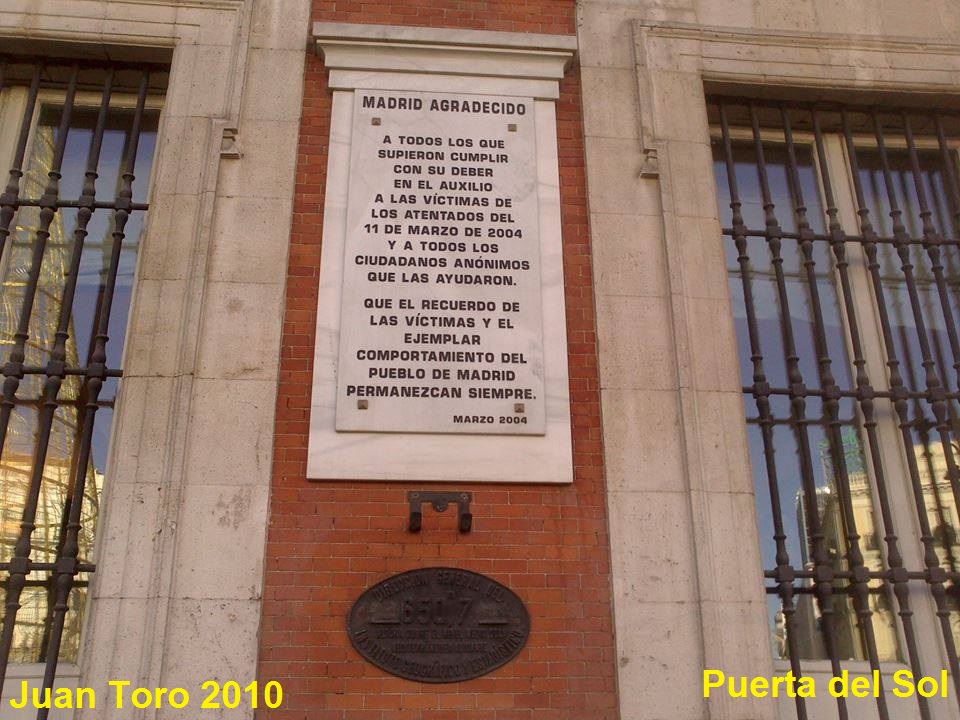 Prosigamos nuestro recorrido por la calle Mayor, enseguida llegamos a la conocida Puerta de Sol por ser un lugar de encuentro, comienzo de las carreteras radiales españolas y lugar de celebración con uvas de las nocheviejas. En el ediificio del reloj, hoy sede de la Comunidad de Madrid, debajo de la placa de conmemoración de triste recuerdo, por las víctimas del brutal atentado de los trenes del 11M, hay otra placa de nivelación con sus 650,7 metros. (Pulsa en la imagen para más detalle)