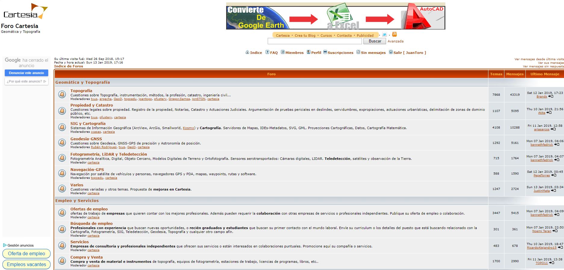 El foro es lo que más conozco de Cartesia, (también tiene un repositorio de noticias sobre Cartografía y Fotogrametría) y allí he aportado mi granito de arena en los momentos que alguien ha preguntado algo que cubre mi experiencia.