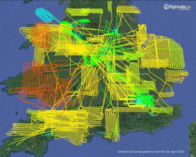 Una de las peculiaridades más visibles de la trayectoria de los aviones en estos momentos son los vuelos cartográficos. Estos vuelos se vienen realizando por diversos motivos. Algunos vuelos capturan imágenes para servicios cartográficos; los mapas «vista satélite» que se utilizan en los servicios cartográficos comerciales a menudo se recopilan a partir de imágenes aéreas. Otros vuelos están completando otros proyectos de topografía utilizando tecnología LIDAR. Otros vuelos son para proyectos ecológicos, obras de ingeniería, o incluso comprobar posibles fugas en tuberías.»