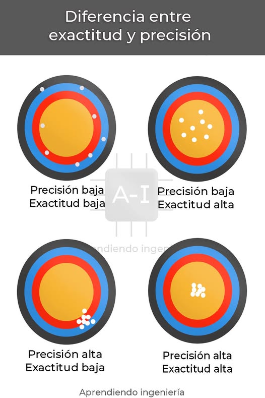 Imagina que estás tirando dardos a un blanco. Si los dardos se agrupan cerca del centro del blanco (exactitud) y también están cerca unos de otros (precisión), estás tirando tanto de forma precisa como de forma exacta. Si los dardos se agrupan entre sí, pero lejos del centro, estás tirando de forma precisa pero no exacta. Si los dardos están dispersos por todo el blanco, no estás tirando ni de forma precisa ni de forma exacta.