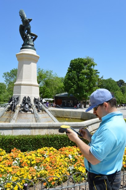 En parque del Retiro Madrid (2016) con un Trimble GEO7 cm frente a la estatua del Angel Caido comprobando los 666 metros de altitud. (https://interesporlageomatica.com/2016/05/24/la-puerta-del-infierno-altitud-666-esta-en-madrid/)
