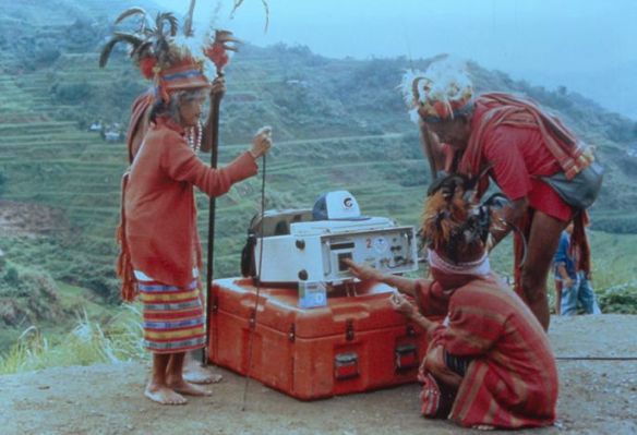 Tribu de Malasia usando el primer receptor cinemático «de mochila» Trimble 4000 LSD. 20 Kilos sin baterías. El receptor empezó a comercializarse en 1988. Fuente GPS World
